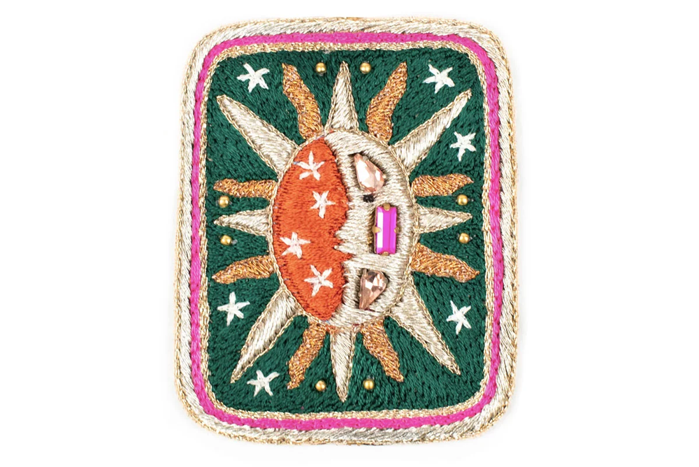 Brooch hand-embroidered with silk thread depicting an eclipse (sun and moon). Stainless steel beads, strass, leather lining, stainless steel and anti-allergenic brass fastener.