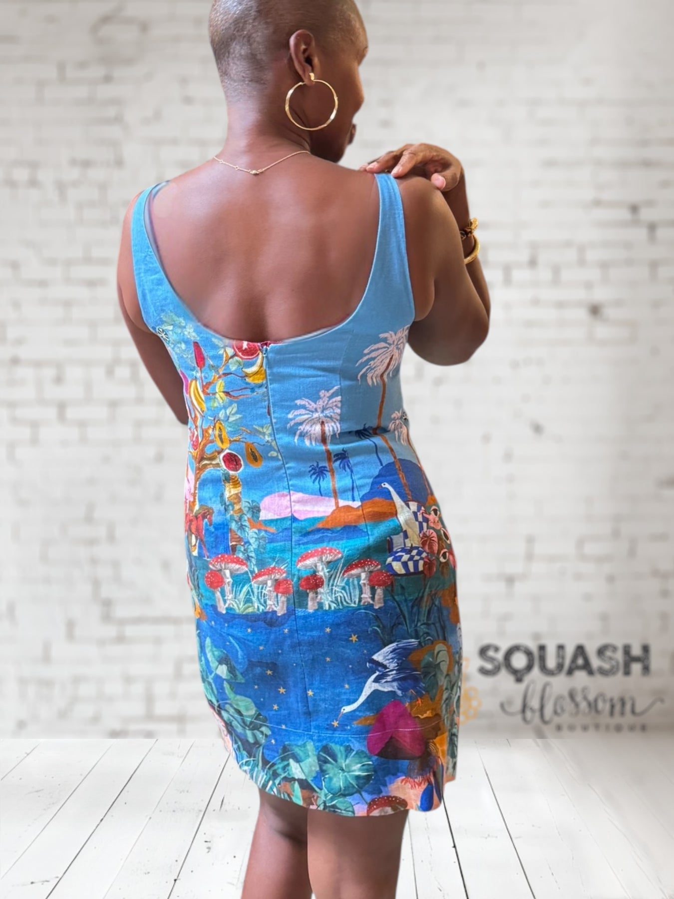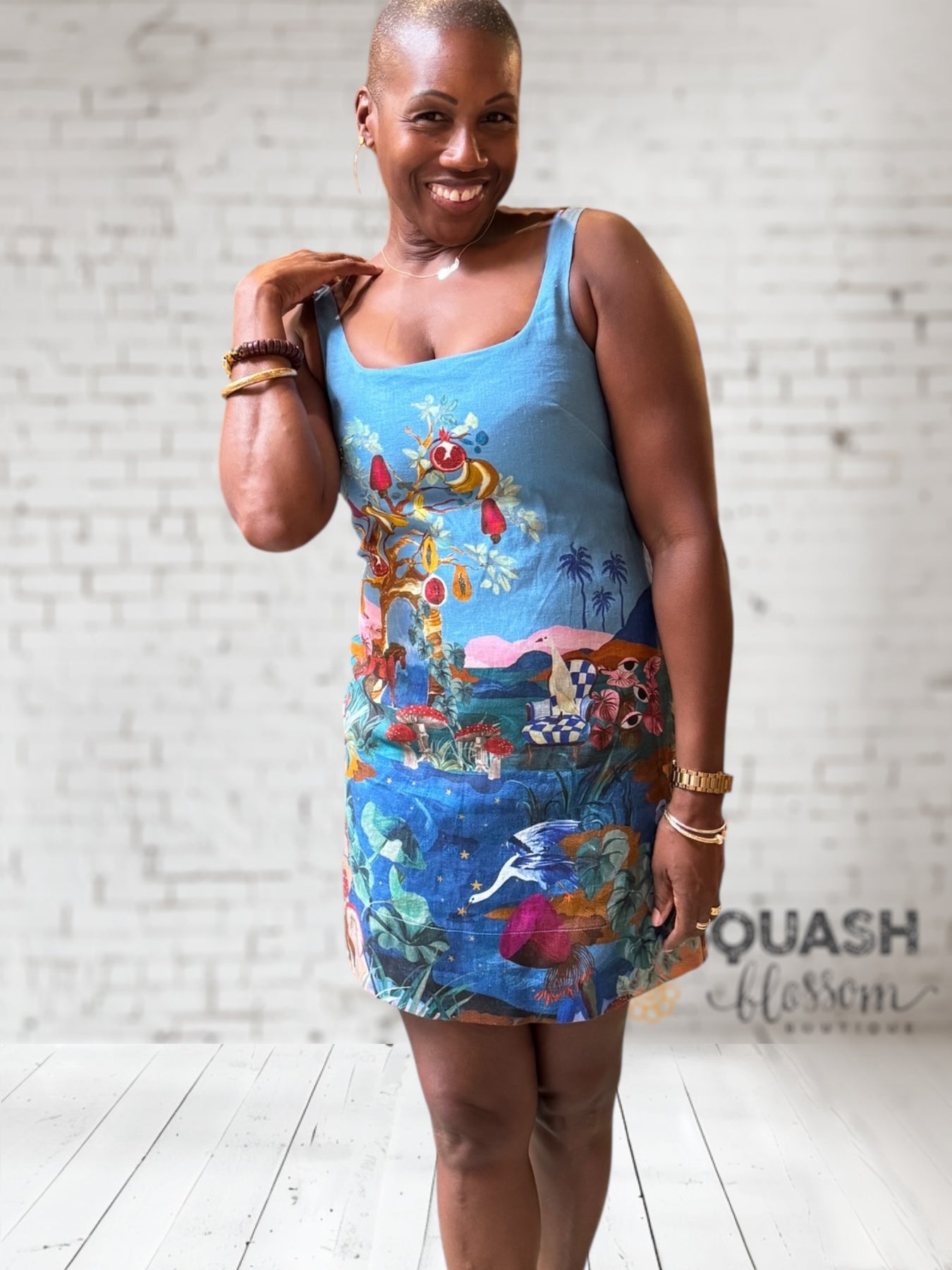 Get ready for summer nights with this super chic mini dress! Crafted from quality linen, this dress features an eye catching landscape scene against a brilliant blue back ground, a scoop neckline, and no sleeves.
