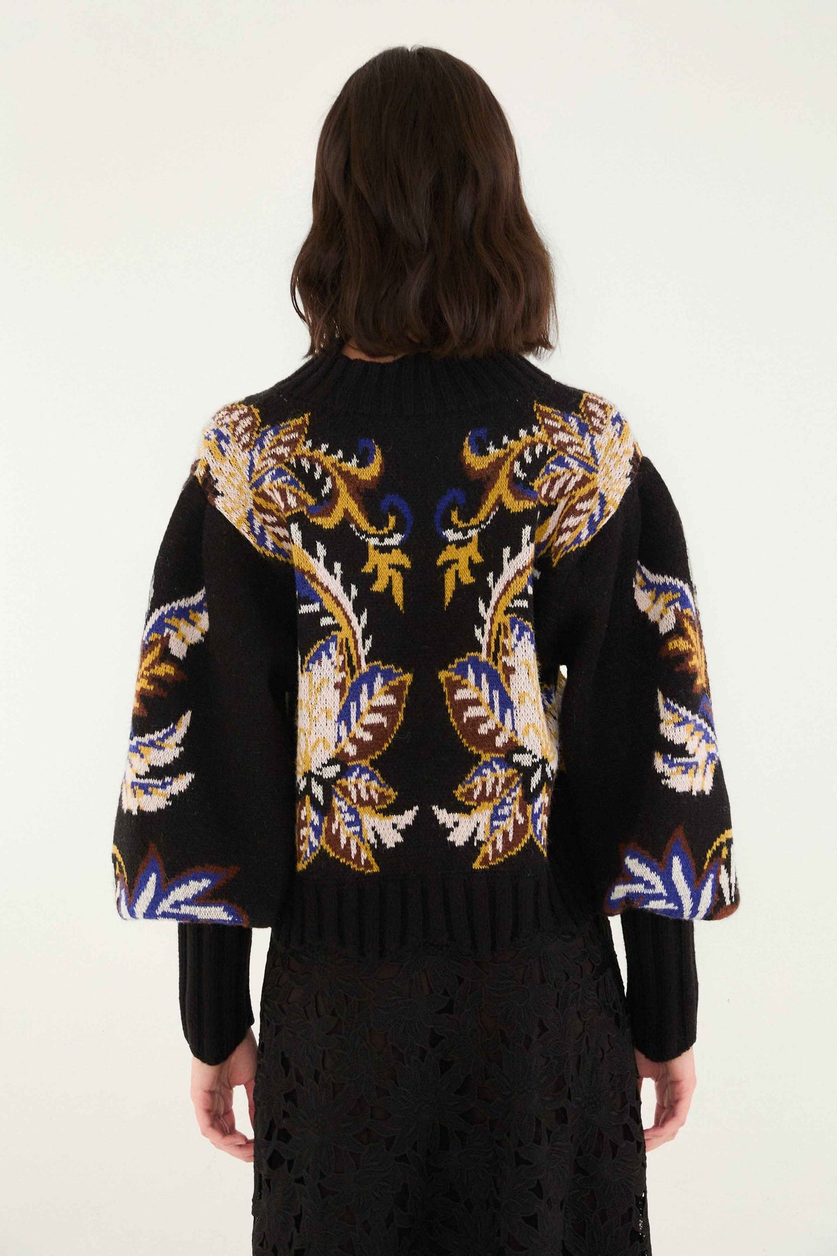 The Arabesque Paradise Knit Sweater enchants with its high neckline and voluminous sleeves, embracing a relaxed yet elegant silhouette. Crafted in deep black, it features a rich arabesque pattern in warm gold, royal blue, and creamy white hues, evoking a sense of adventurous spirit and cozy sophistication. This knitwear piece invites playful charm and timeless style, perfect for layering moments filled with warmth and artistry.