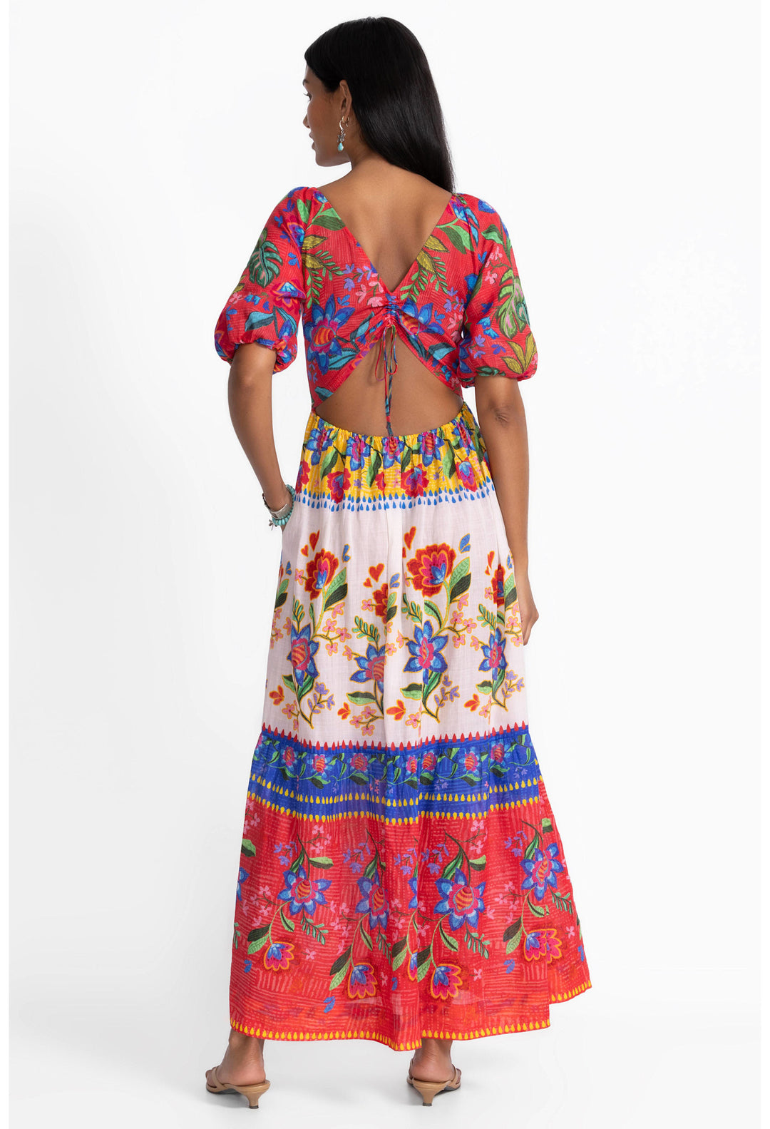 Designed with a V-neckline and gently puffed sleeves, this vibrant dress features an open back and on-seam pockets and is finished with a breezy tiered skirt. Pair with a wide-brim sun hat and strappy sandals for a vacation-inspired look.