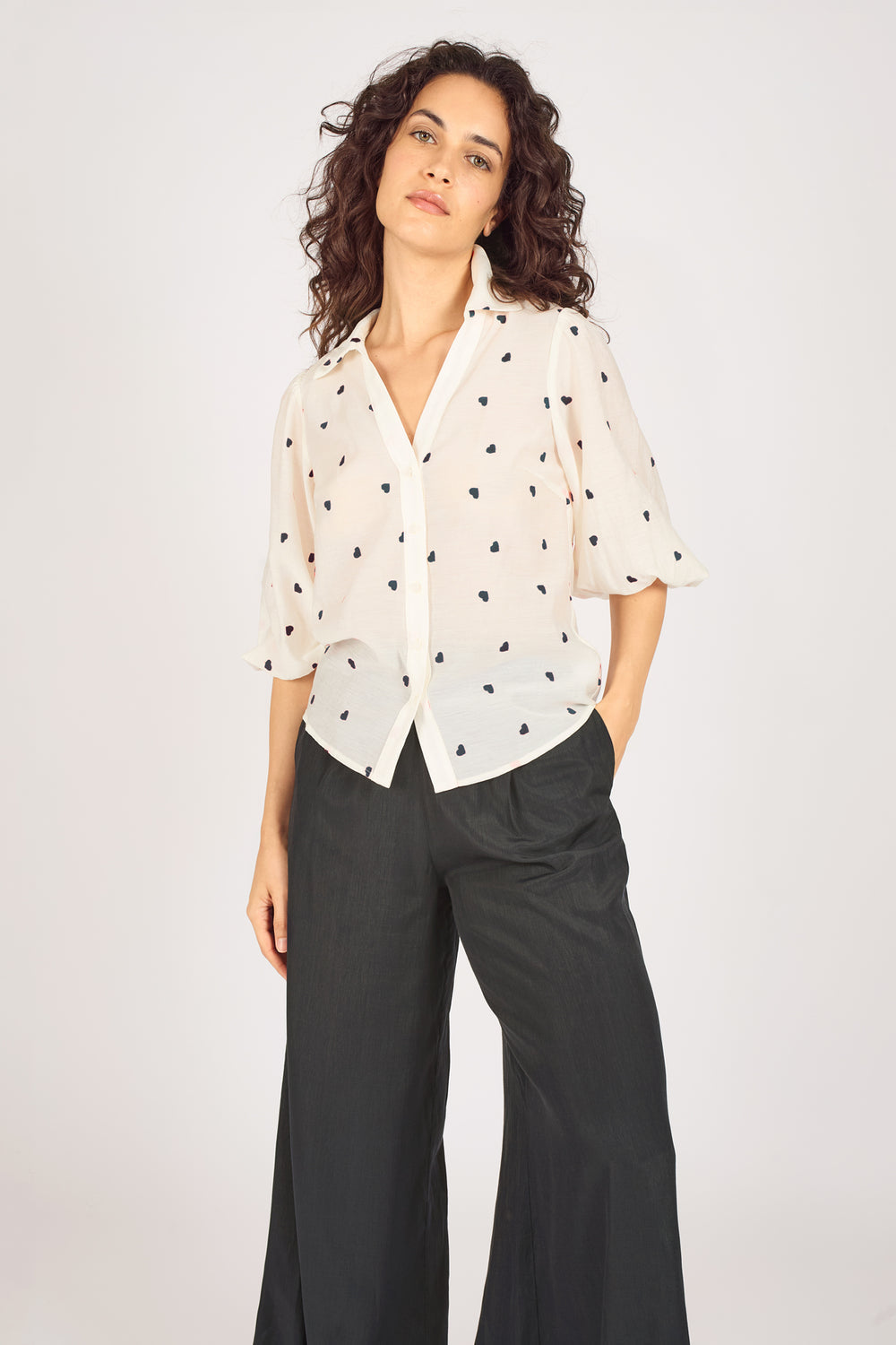 The Charlie Shirt is the perfect addition to your Spring wardrobe. A simple button up top in this sweet white and navy heart print. Made with 100% cotton to keep you comfortable and cool on those warmer summer days. Featuring a classic shirt collar and bracelet sleeves.