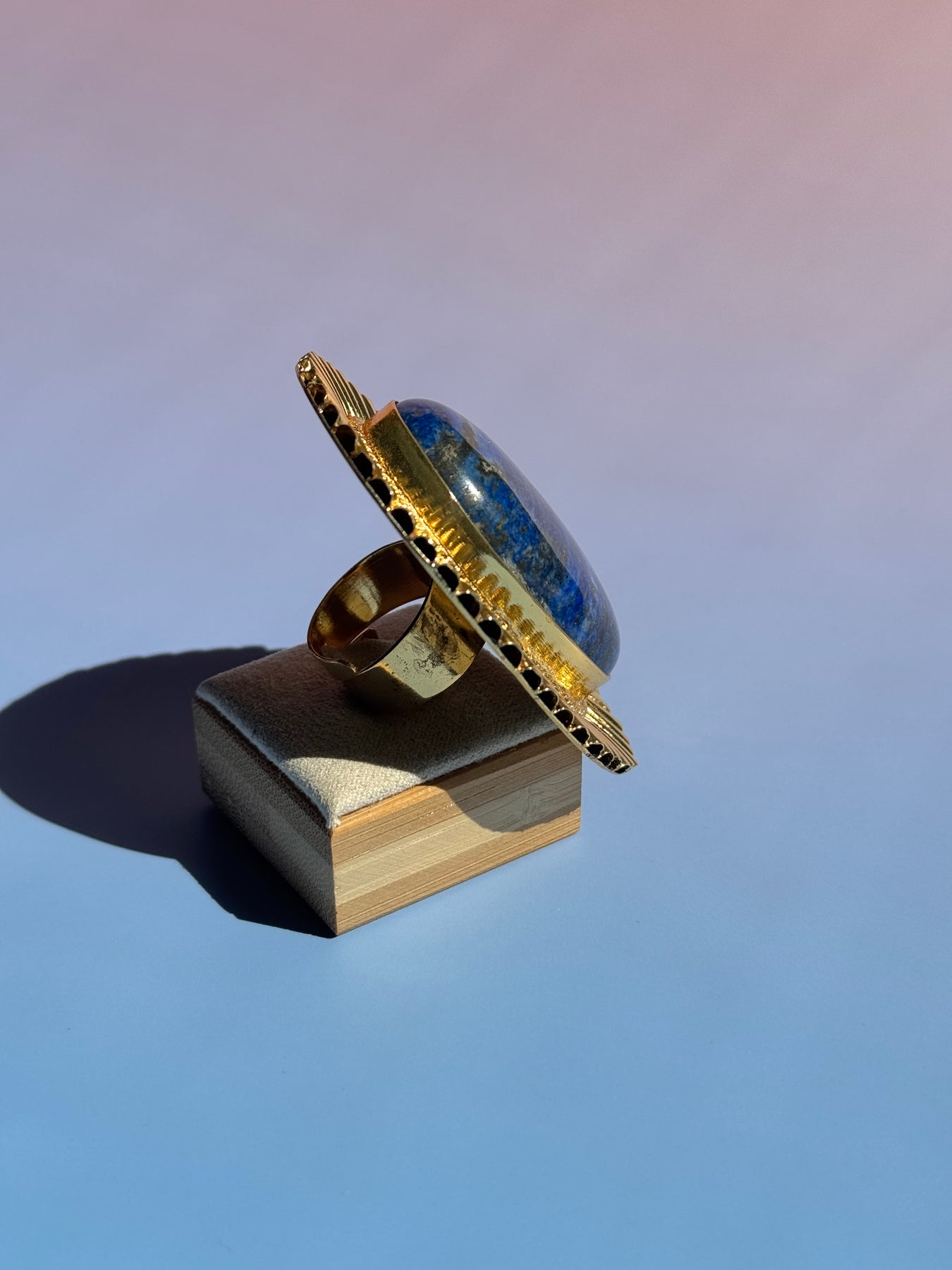 This stunning ring is eye catching and statement making! Crafted from quality materials, this ring features a large Lapis Lazuli stone as its center piece, gold plated setting with geometric embellishments, and is adjustable!