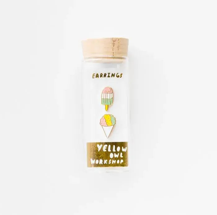 Presented in glass vial packaging these unique earrings blend a sense of gold glamour with a charming twist. The mismatched yet perfectly paired cloisonné petite studs are gilded in 22 karat gold and have hypoallergenic posts.